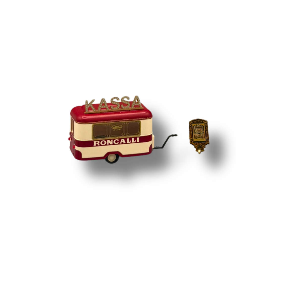 In den originalgetreuen Roncalli-Farben gestaltet und mit typischer „Kassa“-Beschriftung versehen, fängt dieses Modell die nostalgische Atmosphäre des traditionellen Zirkuslebens perfekt ein. Der Anhänger steht für jene besonderen Momente rund um die Manege – vom Programmheft-Verkauf bis zu kleinen Erinnerungsstücken für die Besucher.